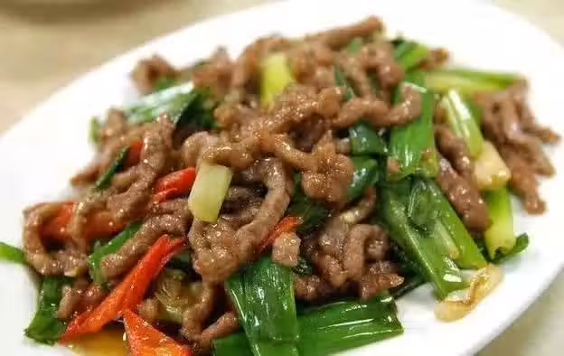 2、鍋內油熱之後炒香一半蔥絲和蒜末。放入牛肉炒到九成熟,加入剩餘的蔥段,生抽,鹽,雞粉,白鬍椒,香油。翻炒,出鍋。