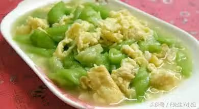 4、鍋中底油,油微熱放薑末爆香,倒入焯過水的絲瓜,加鹽翻炒。大火翻炒30秒後,就可以加待用的蛋花。一起混炒也不要太長時間,20-30秒也就可以出鍋了。