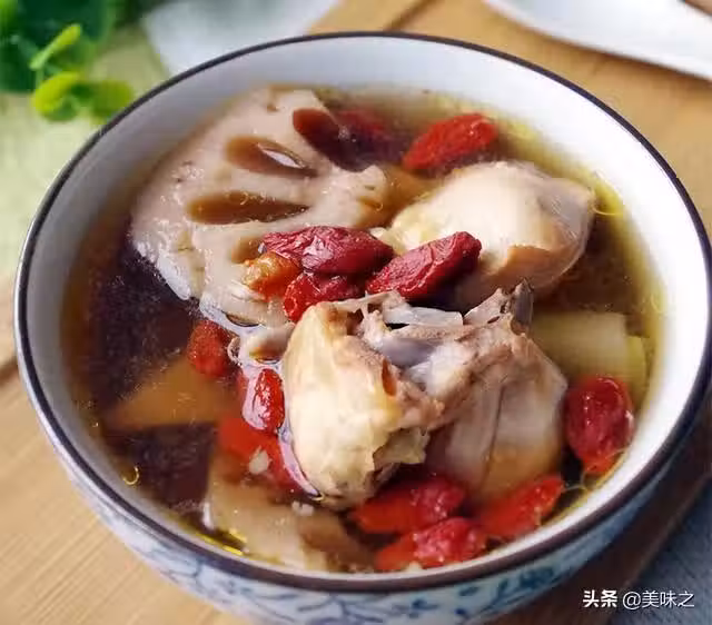 雞肉小半隻、蓮藕1段、山藥1根、花生100g、枸杞50粒、老薑1塊、料酒2.5毫升、大蔥4小段、食鹽適量。