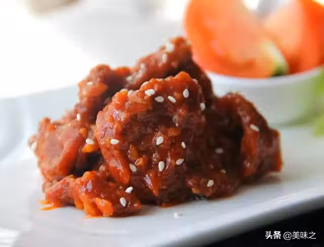 7、把肉盤倒入醬汁中迅速翻炒,起鍋,(番茄醬中含有鹽了,所以沒放鹽,)撒上一點點白芝麻即可。