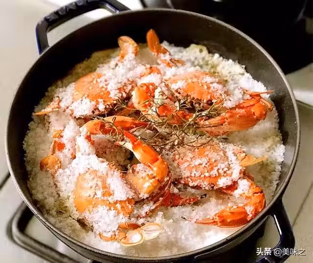 1、將螃蟹刷洗乾淨、瀝干水分、並用廚房紙擦乾水分、在鍋中倒入2斤粗鹽、量要多一點、因為等會要用鹽把蟹整個覆蓋住。