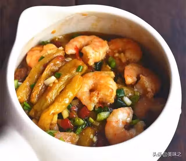 7、放茄子和蝦球,大火燒兩分鐘。