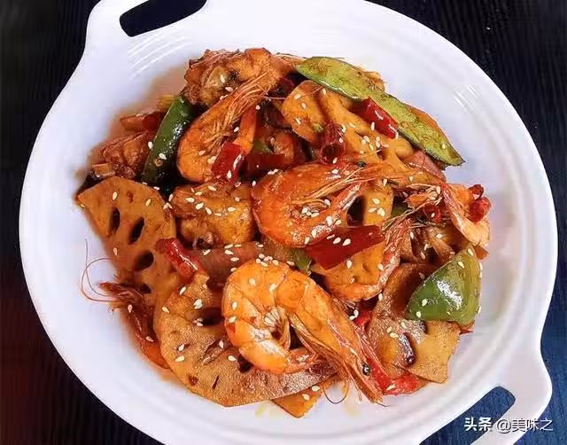 鮮蝦、雞全翅、青椒、紅辣椒、芹菜、紫洋蔥、荷蘭豆、蓮藕、蔥、大蒜、干紅辣椒、花椒、老乾媽麻辣醬、生抽、鹽、糖、老抽、陳醋、薑片、料酒、熟芝麻。