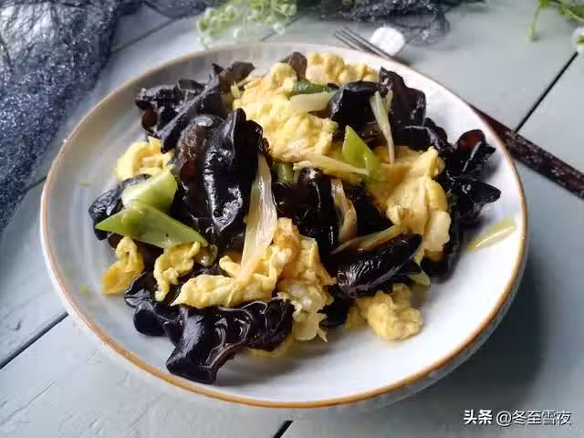 【木耳炒雞蛋】所需材料:干木耳1把、雞蛋3個、大蔥2棵、油鹽適量、
