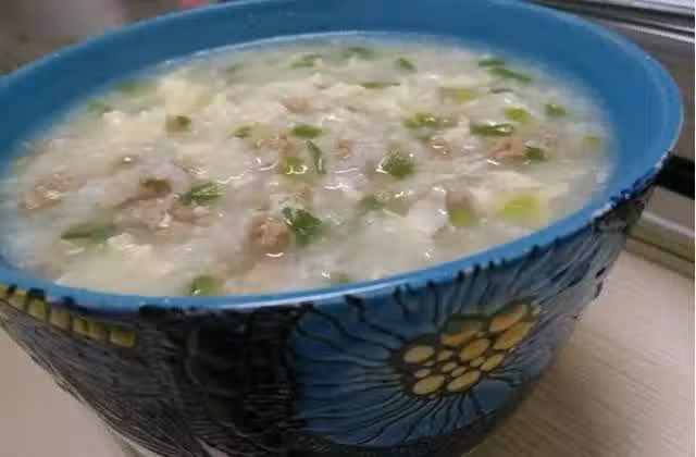 4、打雞蛋,粥快熬好時放入肉沫,並攪拌,五分鐘後放入打好的雞蛋,攪拌,粥滾後倒入蔥花