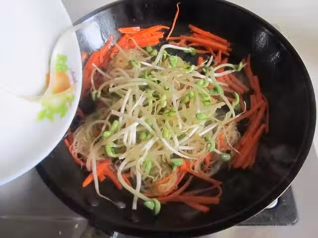 5. 再放入豆芽菜進去翻炒;