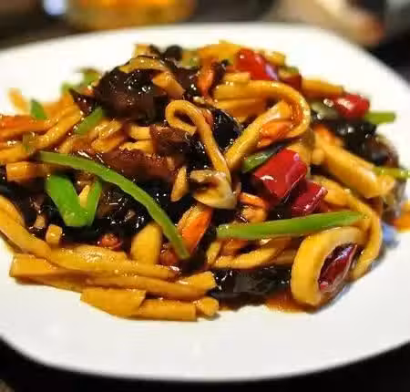 材料:千葉豆腐150克,耳50g,胡椒30g,胡蘿蔔50g,適量大蒜,紅椒干,1小匙糖,半匙白醋,1匙陳醋,鹽2g,小胡椒粉,小澱粉,1勺生醬油,1匙干澱粉。