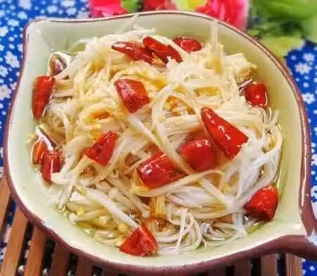 食材:金針菇300g、油適量、鹽適量、生抽適量、白砂糖適量、干辣椒適量