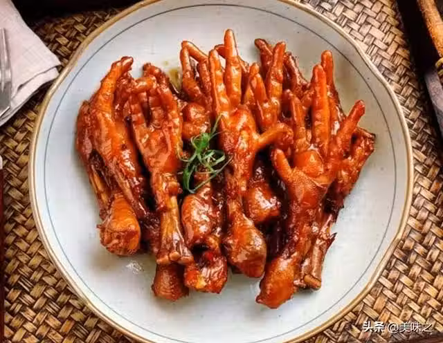 11、將雞爪盛入盤子裡,表面放上蔥葉做裝飾,美味的紅燒雞爪就做好了。