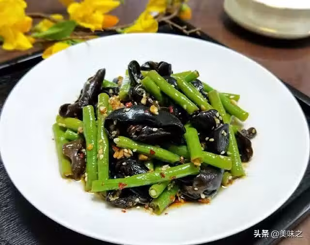干木耳10g、豆角100g、蒜適量、熟芝麻適量、干辣椒碎適量、醬油1勺、陳醋1勺、糖1匙、香油少許、熟油適量。