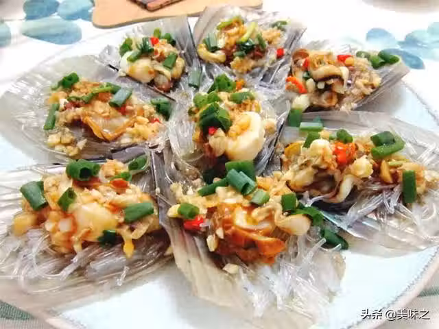 4、將帶子殼擺盤,先放上粉絲,然後放上帶子肉。
