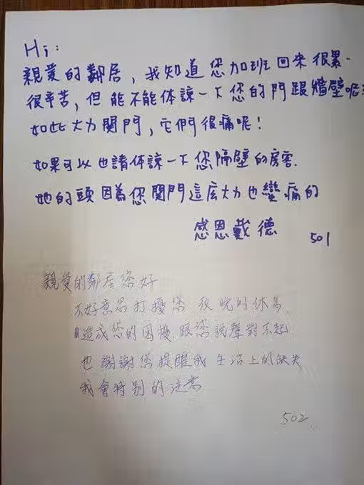 睡不著!深夜鄰居摔門困擾她,留便條希望改善結果令人震驚