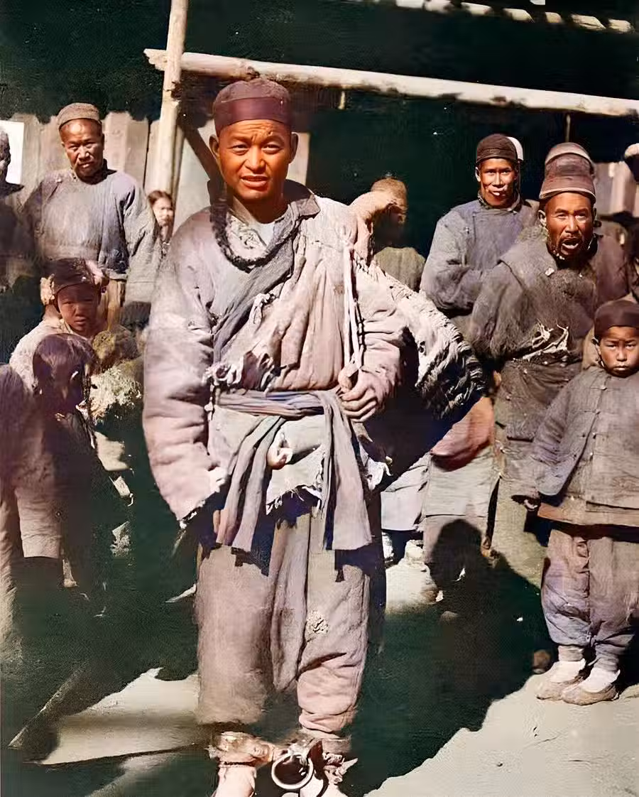 清朝時期,一名男子站在街邊。他身穿破舊的棉衣,身後背著一個竹簍。讓人驚訝的是,他的雙腳上套著腳鐐。可見,他是一名犯人。
