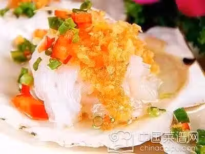 2、將爆香的蒜末與另一半生蒜末調入少許鹽,雞精混勻備用;洗乾淨的扇貝用刀剖出,將粉絲剪成小段,然後鋪在貝殼裡,均勻的撒一點點兒細鹽。