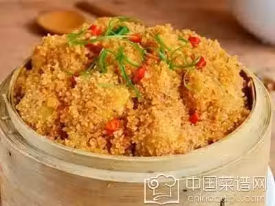 3、加入蒸肉米粉,攪拌均勻,蒸籠底下鋪好菜葉,把沾了米粉的土豆進去,置入蒸鍋中火蒸35—40分鐘,至熟透即可。