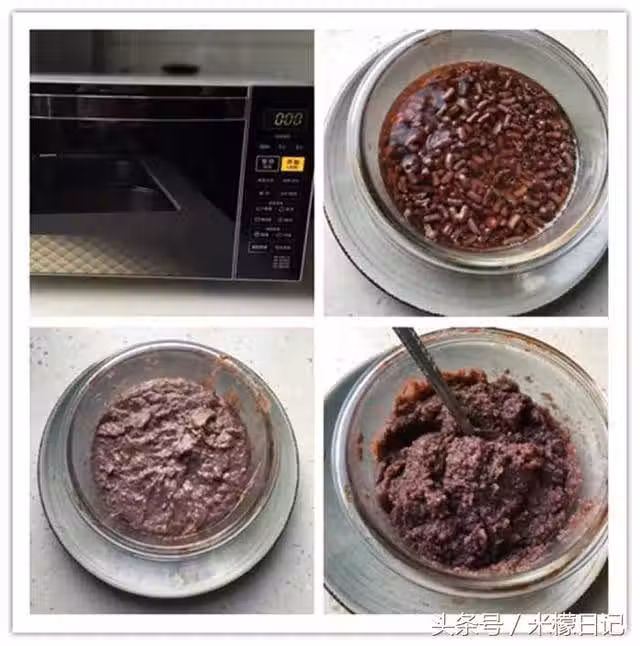 5. 紅豆餡製作:紅豆洗凈,加兩倍清水提前浸泡一夜,加幾滴油,微波火力P100,時間9min,注意要留大氣孔;