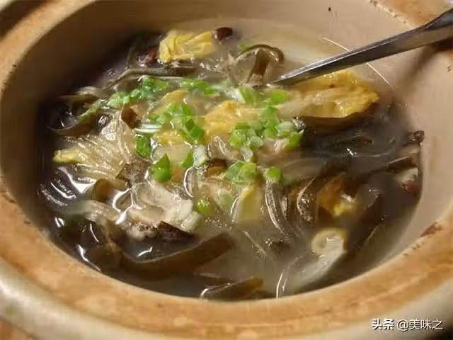 6、湯煮開後,將海帶絲和白菜也倒進去煮開後,用小火燉煮10分鐘。