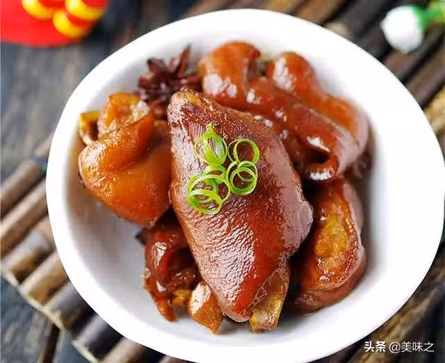 豬蹄2個、植物油2湯匙、冰糖3小勺、料酒2小勺、老薑4片、小蔥4顆、生抽2湯匙、老抽0.5湯匙、八角2個、花椒1小勺。