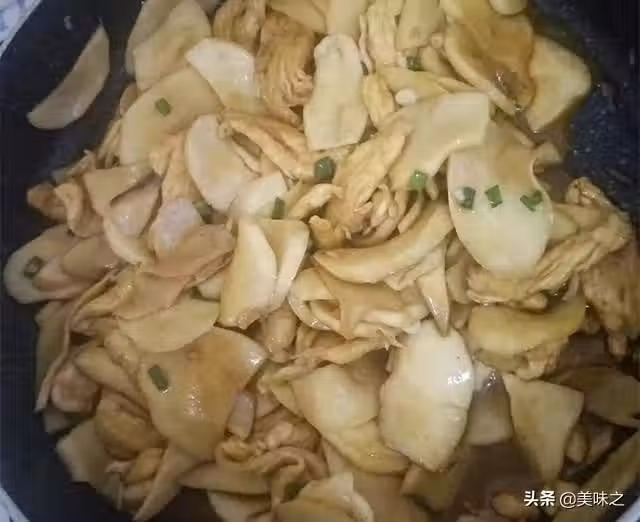 4、倒生抽,雞肉上色了,下杏鮑菇。