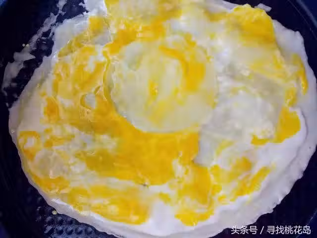 3. 用鍋鏟把雞蛋黃弄散,將整個蛋液塗滿餅,小火加熱到蛋液八成凝固。小提示:如果倒進鍋里的麵糊多,餅會稍厚,麵糊少的話,餅會稍薄,看個人喜歡吃哪種了。這個圖是第二次攤得稍厚的餅。
