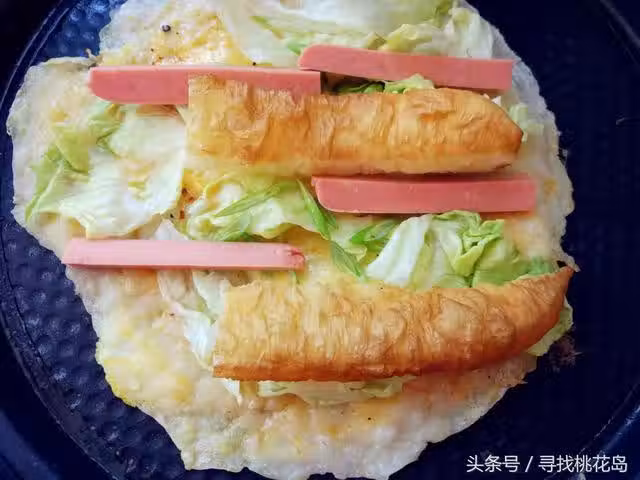 5. 關火,將西生菜葉掰小片、分成四瓣的香腸、油條放在餅上,用鍋中的餘溫烘熟底部的雞蛋。喜歡吃蔥花的可以撒一些,也可以在第三步把蔥花撒在沒熟的蛋液里。