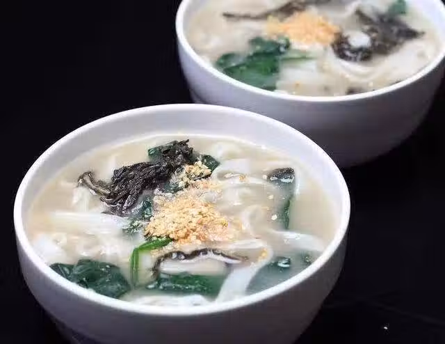 5、麵條煮至9分熟時,下入芝麻葉,再煮至全熟時出鍋盛碗。