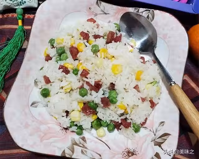 米飯1碗、臘腸半條、豌豆少許、玉米少許、鹽少許、油一丟丟。