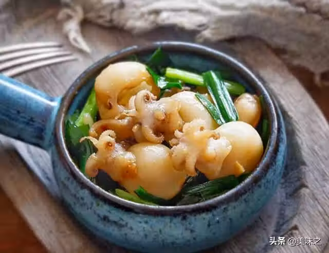 1、墨魚仔處理清洗乾淨,放水中焯燙片刻,撈出瀝水備用。