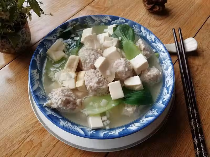 【雞肉丸子豆腐湯】 材料:雞胸肉250克、豆腐1塊、油菜5棵、香油1湯匙、鹽適量、蔥1段、姜10克、白鬍椒粉1茶匙、料酒1湯匙、澱粉2湯匙