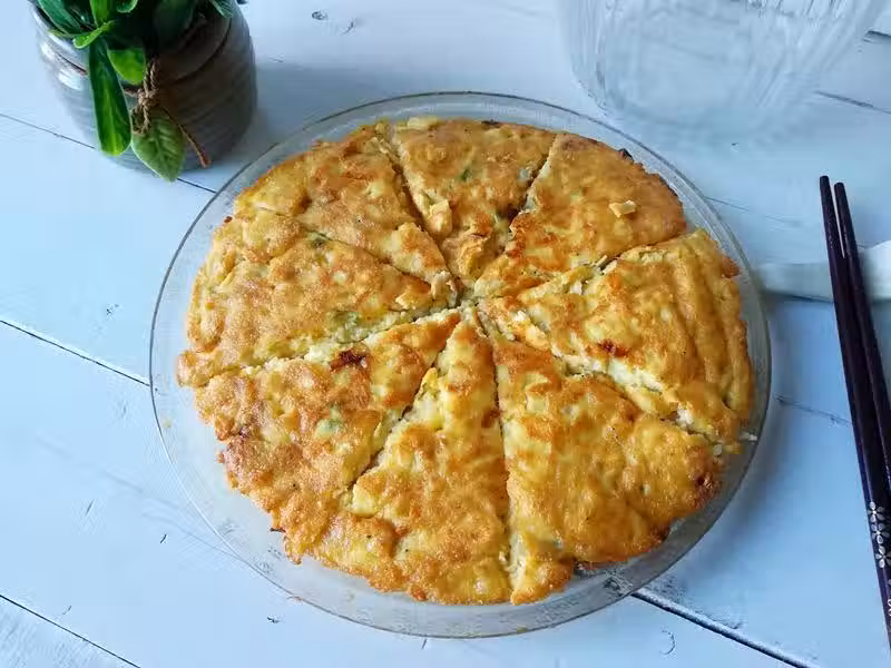 6.將鍋倒扣,這樣蛋餅就扣在盤子上了,在用刀對角切開成塊即可