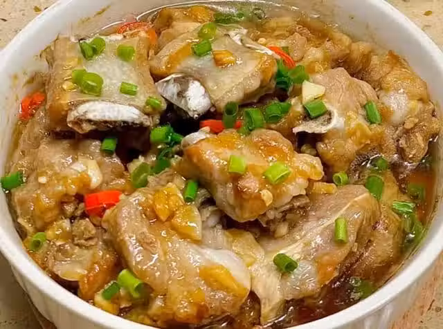 (4)將腌制好的排骨倒入碗中,再放入蒸鍋中,水開上鍋蒸30分鐘左右,至排骨軟爛入味,關火,端出來,再撒上蔥花點綴。