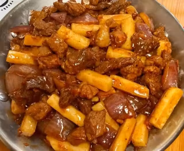 (6)鍋底留油,爆香洋蔥蒜末,下入牛排和年糕翻炒片刻,倒入調味汁翻炒調味。