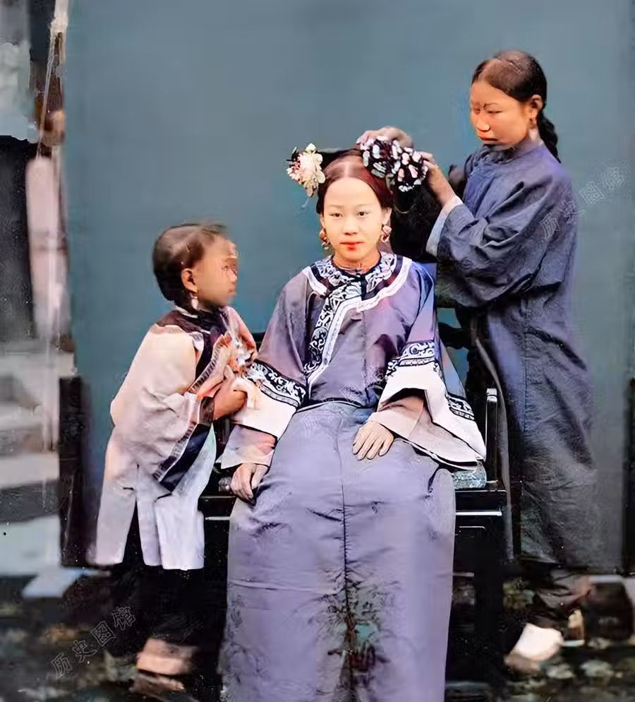 清朝時期,一名富貴人家的女子,衣著華麗,正端坐在椅子上。身旁的女僕,穿著樸素的衣服,正在為她精心佩戴頭飾。