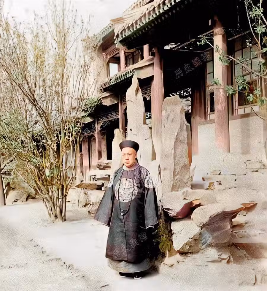 清朝時期,肅親王善耆身穿朝服,站在花園里。善耆,清朝十二家鐵帽子王之一。清太宗皇太極長子肅武親王豪格後代,女間諜川島芳子生父。民國十一年(1922年)病死於旅順,享年56歲。