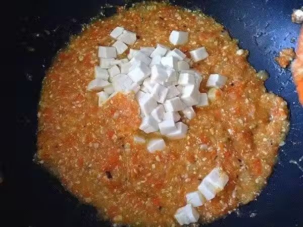 再次滾起,迅速倒入剩下的豆腐丁,晃動鍋子使豆腐和湯羹均勻,加蓋悶一小會兒到再次燒滾就可以了,如果之前水加的多了,開蓋火調大些湯汁收一收即可。
