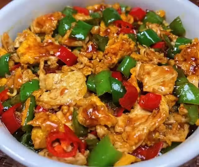 (4)再下入青椒翻炒至斷生,倒入炒熟的雞蛋一起翻炒片刻。