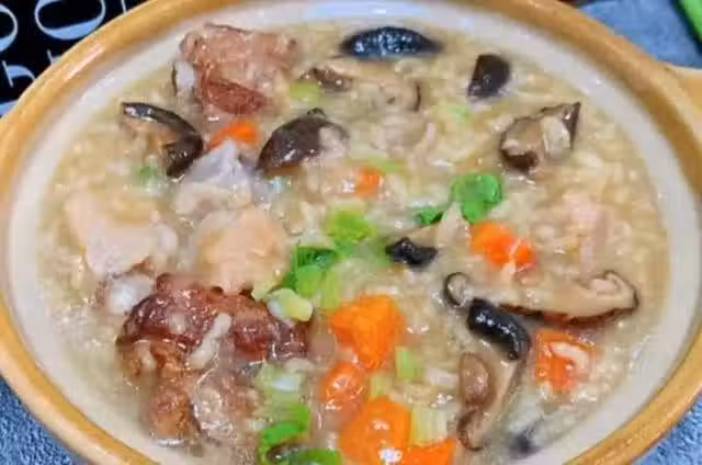 (1)處理食材:芋頭和胡蘿蔔洗凈去皮切塊,排骨洗凈浸泡片刻,泡去血水撈出沖洗一下,干香菇泡發,大米淘洗乾淨,小蔥切蔥花,生薑切片備用。