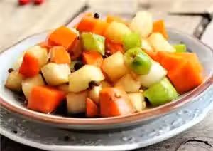 1、白蘿蔔、胡蘿蔔去皮切成指頭大小丁,櫻桃小蘿蔔切成指頭大小丁。