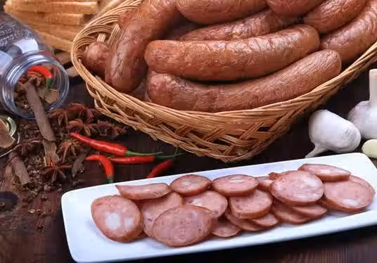 4.烘烤。將紅腸放進烘箱內烘烤,烘烤溫度掌握在65~80℃,標準以腸衣呈乾燥,肉餡呈紅色為佳。