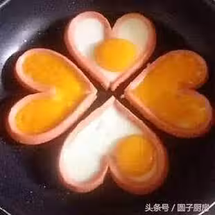 做好愛心後開火火不要大鍋熱後將雞蛋打入心內還可以將蛋黃輕輕挑破把蛋黃澆均勻這樣顏色更漂亮
