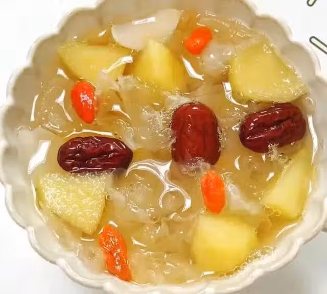 (1)蘋果洗凈去皮切小塊,紅棗洗凈表麵灰塵,銀耳洗凈放入碗中,加入適量清水浸泡片刻,撕成小塊備用。