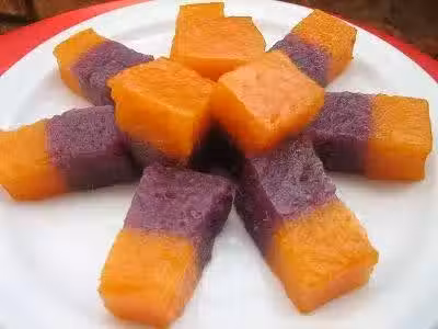1、 (底層)將幼糖和稀椰漿加入紫心番薯泥攪拌勻,加入木薯粉和鹽攪拌均勻。倒入9寸盤裡大火蒸25分鐘。