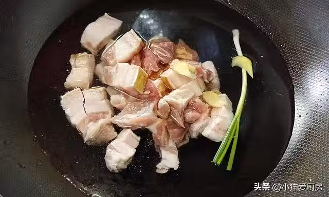 【步驟五】:鍋中少放一點油,放入冰糖,炒至大泡泡變成小泡泡,倒入焯好水的五花肉,翻炒上色,放入蔥姜、干辣椒、大蒜,炒出香味。