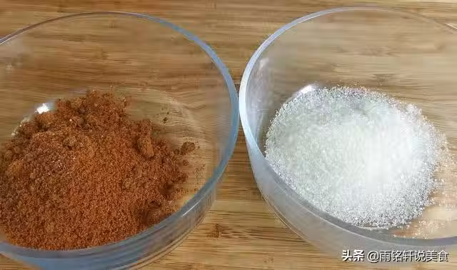 第二步:準備兩個玻璃碗,碗中分別倒入45克的紅糖和白糖。加兩種糖是讓九層糕看起來層次分明。