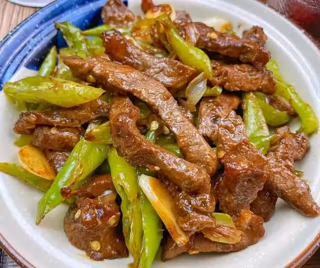 (3)鍋中熱油,下入腌制好的牛肉,翻炒變色,再下入杭椒翻炒片刻。