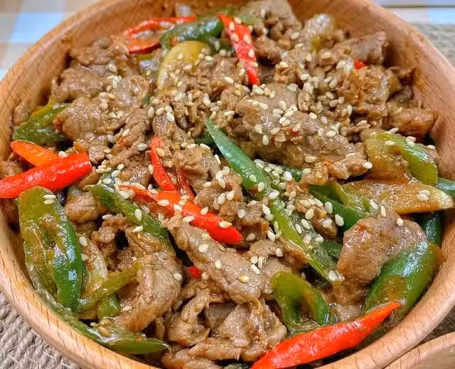 (4)鍋底留油爆香蒜末,下入青紅椒翻炒至斷生,再下入炒熟的牛肉翻炒片刻。