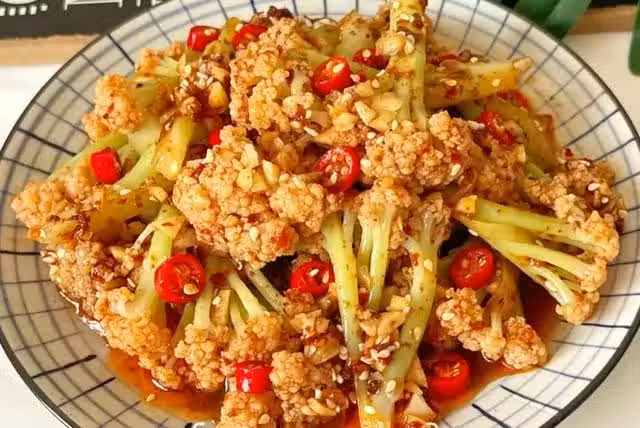 (4)將調好的料汁淋在花菜上面,拌均勻即可開吃了,低脂低卡香辣過癮,好吃不長胖,減肥人士必備的一道涼拌菜!