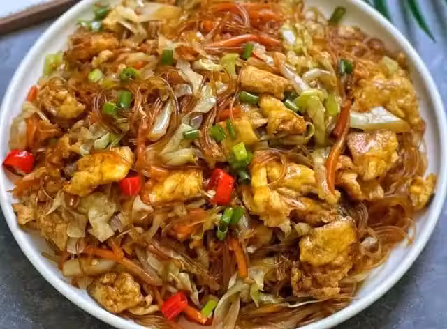 (3)鍋底留油爆香小蔥蒜末和小米辣,放入白菜、胡蘿蔔、粉絲翻炒片刻。