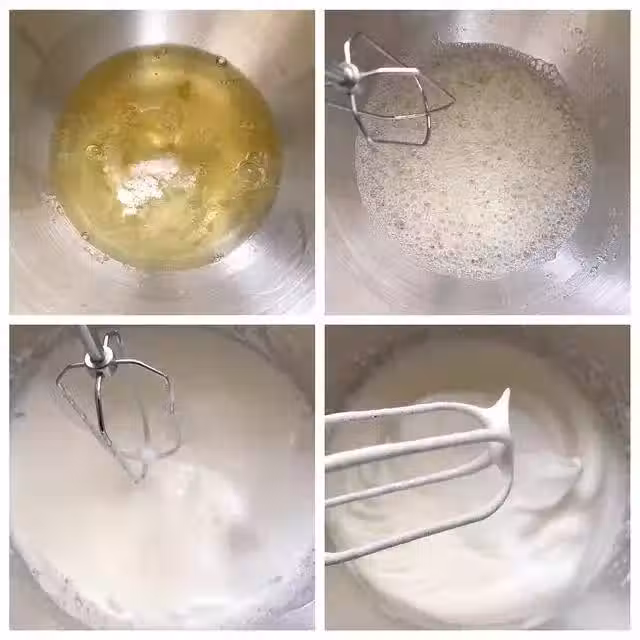 、蛋白打發好後,取三分之一的蛋白霜放入蛋糊中,用刮刀翻拌均勻,接下來再取三分之一的蛋白霜放入蛋糊中,按照上面的翻拌手法翻拌均勻,最後將拌好的麵糊倒入剩餘的蛋白霜中,同樣的手法翻拌均勻,這樣蛋糕糊就製作好了。——(、蛋白霜與麵糊攪拌是蛋糕能不能發起來的關鍵,要使用炒菜方式翻拌或者Z字型手法翻拌都可以,千萬不要用打圈的方式翻拌,這樣蛋白霜的氣泡會被打破,從而影響蛋糕的膨脹。、翻拌蛋白霜與麵糊要手法輕柔,慢慢地翻拌,不要粗暴有力,這樣也會影響蛋糕的膨脹。)