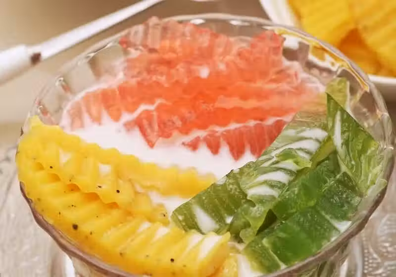 果汁加入洋菜粉製成的緬甸甜點:摩摩喳喳,口感脆口。